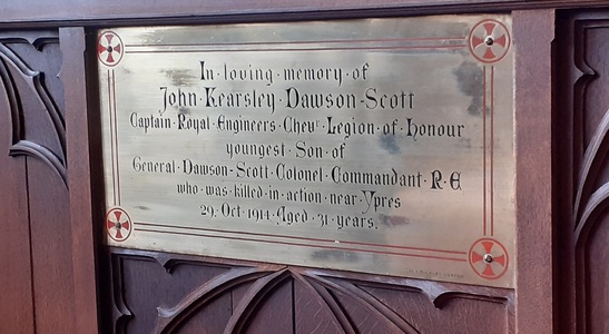 In loving memory of / John Kearsley Dawson-Scott / Captain Royal Engineers Chev'r. Legion of Honour / youngest Son of / General Dawson-Scott Colonel Commandant R.E. / who was killed in action near Ypres / 29 Oct 1914 Aged 31 years.