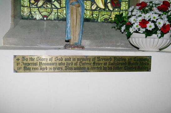 To the Glory of God and in memory of Bernard Hadley, 3rd Company 1st Imperial Yeomanry who died of enteric fever at Ladybrand, South Africa 31st May 1900 aged 26 years. This window is erected by his father Charles Hadley.