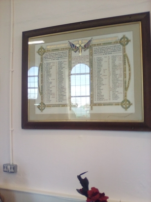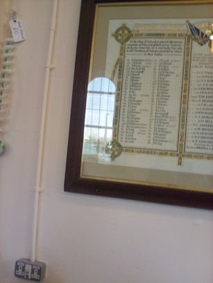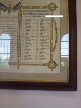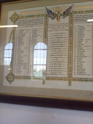 Central Panel- [The Fallen] LIEUT CT HOLLAND RFA/ LIEUT H WILD MC NF/ SERGT TA BOWNES 8TH BORDER/ SERGT AR HALL 2ND BORDER/ SERGT AS BOWMAN DCM RF / CPL JW FLETCHER PWO SL/ SIGNALLER TOM JOHNSON NF/ RIFLEMAN A BRUNSKILL W YORKS/ PTE TW LAMB OTAGO MR NZ/ PTE J SCRIVENS 3RD BORDER/ PTE WM M MASON 5TH BORDER/ PTE A MORLAND COLDSTREAM G/ PTE H BELL 1ST E YORKS/ PTE C SANDERSON MG CORPS/ PTE W BROGDEN SAC/ PTE N HEAVISIDE NF/ PTE DF BRUNSKILL LANCS F/ PTE R GASKARTH LANCS FUS/ Died through War Service BRIG GENERAL BREEKS CB RA/ Left Hand Panel- [The Served]- Column 1- Major H Oxley Ingham TD RFA/ Capt CW Brooks SAMC/ Cpl TW Iceton 11th Border/ Cpl Ron Longstaff 11th Border/ Cpl J Ellwood 11th Border/ Pte S Nicholson 11th Border/ Pte T Tinkler 11th Border/ Pte C Hutchinson 11th Border/ Pte E Wilkinson 11th Border/ Pte Wm Jackson 11th Border/ Pte R Slee 11th Border/ Pte Jas Yare 12th Border/ Pte JW Lee 12th Border Pte J McNaughton 12th Border/ Pte JJ Dinwoodie 12th Border/ Pte AJ Jones 12th Border/ Pte J Coates 3rd Border/ Pte JH Nicholson 3rd Border/ Pte J Dobson 3rd Border/ Pte Wm Whelpdale 3rd Border/ Pte JR Harrison 3rd Border/ LCpl SH Wilkinson 1/4th Border/ Pte Wm Dinwoodie 4th Border/ Pte HD Hall 5th Border/ Pte HG Luff 2/4th Border/ Pte G Swall 2/4th Border/ Pte H Davidson 2/4th Border/ Pte Jas Lamb 2/4th Border/ Column 2- Pte JM Lamb 2/4th Border/ Pte JE Ellwood 2/4th Border/ Cpl PR Ward KORL/ Pte AH Ward KORL/ Pte Geo W Harrison KORL/ Sgt JW Brogden RE/ Cpl F Sayer RE/ LCpl T Bowman RE/ Pionr WH Bailey RE/ Spr T Taylor RE/ Spr TA Cooper RE/ Spr Geo Wilson RE/ Spr Wm Bowman RE/ Spr Geo Bowman RE/ Spr J Bowman RE/ Spr D Alderson RE/ Spr T Burne RE/ Spr Wm J Slee RE/ Spr Rbt Longstaff RE/ Spr Horace Wilson RE ROD/ Lieut TB Allison RASC/ Dvr HA Thompson RASC/ Pte HJ Ward RASC MT/ Pte Reg Bowman RASC MT/ Pte Wm W Thompson RASC MT/ Pte B Whelpdale RASC MT/ Pte JT Bowman RASC MT/ Cpl WH Sanderson ASC/ Pte JW Craig MGC/ Right Hand Panel- [The Served] Column 1- Pte R Bowman MGC/ Pte Jas Sanderson MGC/ Pte JD Wilkinson MGC/ Siglr Geo Binks RFA/ Gnr JF Hunter RFA/ Gnr JN Houston RFA/ Dvr JE Fletcher RFA/ Dvr F Allison RFA/ Pte FJ Cooper 3RD Yorks/ Siglr J Taylor 4th Yorks/ Pte T Bell 5th Yorks/ Pte JSR Davis 5th Yorks/ LCpl P Dent D of Wellingtons/ Pte R Burton D of Wellingtons/ Gnr CGH Davis RGA/ Gnr TR Tunstall RGA/ Gnr T Lambert RGA/ Gnr TR Allison RGA/ LCpl Wm B Dinwoodie DLI/ Pte Jas Binks DLI/ Pte H Dent DLI/ Pte JW Robinson DLI/ Pte Geo Guy DLI/ Pte Cecil Dent DLI/ Pte H Wilson DLI/ Pte Wm F Ewbanke DLI/ Pte IW Nicholson DLI/ Pte TH Stephenson DLI/ Pte Rd Tunstall LPool Scottish/ Column 2- Pte JB Blackett LPool Scottish/ Sglr F Johnson 2.1 CL Yeo/ Pte ME Scott CL Yeo/ Pte A Rudd LN Lanc/ Pte T Hall LN Lanc/ Pte R Sayer N Lanc// Pte J Deighton 2.5 Cheshire/ Pte GW Allerton 1st Y & L/ Pte TW Binks 4th D Guards/ Pte J Binks QMC-USA/ LCpl G Moss NF/ LCpl N Hoole KL/ LCpl D Dinwoodie RAOC/ Pte AL Hook S Staffs Pte AE Lamb Labour Cps/ Pte JA Brunskill Labour Cps/ Pte WT Brunskill W Kent Yeo/ Pte T Thompson AIF/ Pte C Wilson Manchesters/ Pte AC Blain Seaforth Hglds/ Lieut Geo Bainbridge RAF/ Aircraftn A Abram RAF/ Aircraftn FF Yare RAF/ Pte J Wearmouth RAF/ Pte J Sayer Royal Navy/ Stkr TD Sayer Royal Navy/ Stkr Ed Deighton Royal Navy/ Stkr TD Wilkinson Royal Navy/ Stkr GM Dent Royal Navy/