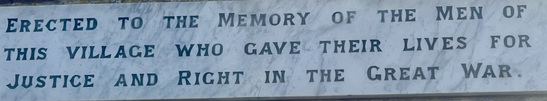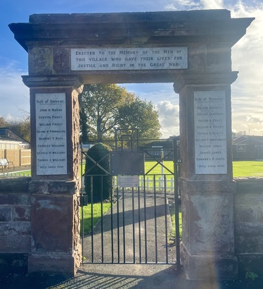 1914 1918/ ERECTED TO THE MEMORY OF THE MEN OF/ THIS VILLAGE WHO GAVE THEIR LIVES FOR/ JUSTICE AND RIGHT IN THE GREAT WAR/ ROLL OF HONOUR/ (NAMES)/ "DUTY NOBLY DONE" (ON PLAQUE SET INTO GATE): 1939 WORLD WAR 1945/ ERECTED IN MEMORY OF/ (NAMES)/ THEIR LIVES FORFEIT - THEIR GLORY UNDYING
