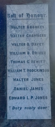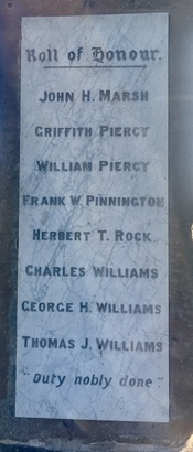 WW1 Walter Brookes, Walter Chambers, Walter B Davey, William B Driver, Thomas C Hewitt, Willim T Hodgkinson, Walter Jones, Walter James, Edward L P Jones, John H Marsh, Griffith Piercy, William Piercy, Frank W Pinnington, Herbert T Rock, Charles Williams, George H Williams, Thomas J Williams. WW2 James Bateman, Glynne Davies and John Griffiths.
