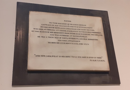 SACRED / TO THE MEMORY OF FRANCIS INGRAM / CAPTAIN IN HIS MAJESTY'S FORTY SIXTH REGIMENT / SECOND SON OF ROWLAND INGRAM B.D. AND MARY HIS WIFE, / WHO DIED OF CHOLERA AT GOONDLACAMAPILLY IN THE MADRAS PRESIDENCY, / ON THE MARCH OF HIS REGIMENT FROM HYDERABAD TO EMBARK FOR ENGLAND, / AND WAS INTERRED AT NAURKAILPILLY. / HE WAS A YOUNG MAN OF PIETY, INTEGRITY, AMIABLE DISPOSITION, / AND HIGH ATTAINMENT. / HE DIED DEC. XXII. MDCCCXXXII. AGED XXIV. / "AND NOW, LORD, WHAT IS OUR HOPE? TRULY OUR HOPE IS EVEN IN THEE" / PSALM XXXIX.