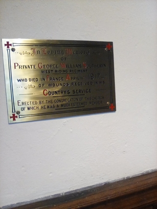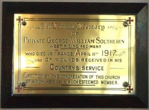 IN LOVING MEMORY OF / PRIVATE GEORGE WILLIAM SOUTHERN / WEST RIDING REGIMENT / WHO DIED IN FRANCE APRIL 11TH 1917 / OF WOUNDS RECEIVED IN HIS COUNTRY'S SERVICE / ERECTED BY THE CONGREGATION OF THIS CHURCH OF WHICH / HE WAS A MUCH ESTEEMED MEMBER