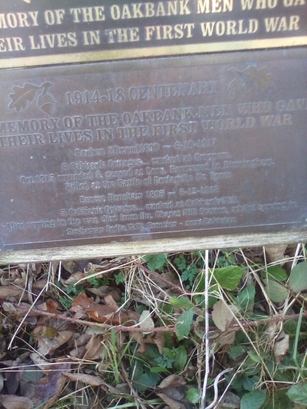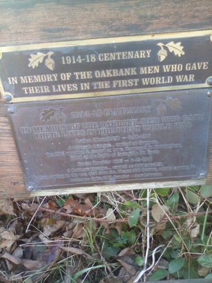 Plaque 1-1914-18 CENTENARY/IN MEMORY OF THE OAKBANK MEN WHO GAVE/THEIR LIVES IN THE/FIRST WORLD WAR; Plaque 2-1914-18 CENTENARY/IN MEMORY OF THE OAKBANK MEN WHO GAVE/THEIR LIVES IN THE FIRST WORLD WAR/[names]