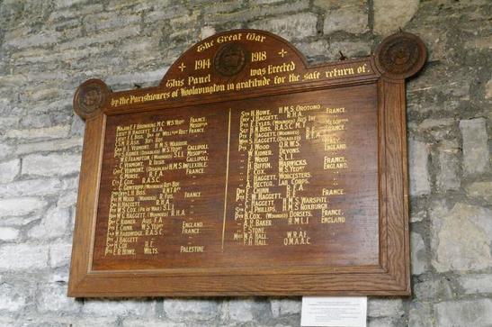 THE GREAT WAR/1914-1918/THIS PANEL WAS ERECTED /BY THE PARISHIONERS OF WOOLAVINGTON/IN GRATITUDE FOR THE SAFE RETURN OF