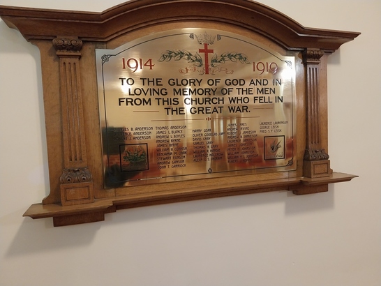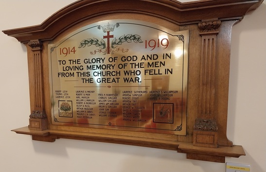 1914 – 1919 / TO THE GLORY OF GOD AND IN / LOVING MEMORY OF THE MEN / FROM THIS CHURCH WHO FELL IN / THE GREAT WAR/[66 names]. Unveiled by Mrs J Williamson of Hangclif Lane & Mrs Sinclair of Burgess Street (Mrs Williamson had lost her husband & Mrs Sinclair had lost two sons in the war), and dedicated 13 May 1923 by Dr Smith, Moderator of the General Assembly of the Church of Scotland