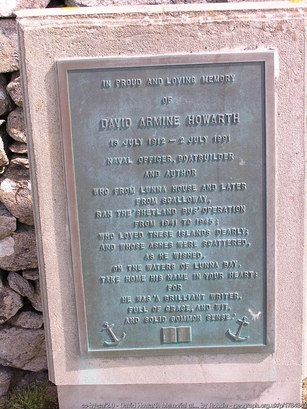 IN PROUD AND LOVING MEMORY/OF/DAVID ARMINE HOWARTH/18 JULY 1912-2 JULY 1991/NAVAL OFFICER, BOATBUILDER/AND AUTHOR/WHO FROM LUNNA HOUSE AND LATER/FROM SCALLOWAY,/RAN THE SHETLAND BUS OPERATION/FROM 1941 TO 1945;/WHO LOVED THESE ISLANDS DEARLY;/AND WHOSE ASHES WERE SCATTERED,/AS HE WISHED/ON THE WATERS OF LUNNA BAY./TAKE HOME HIS NAME IN YOUR HEART/FOR/HE WAS A BRILLIANT WRITER,/FULL OF GRACE, AND WIT/AND SOLID COMMON SENSE