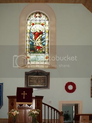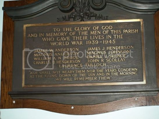 TO THE GLORY OF GOD/AND IN MEMORY OF THE MEN OF THIS PARISH/WHO GAVE THEIR LIVES/IN THE WORLD WAR 1939-1945/[9 names in 2 columns]/"AGE SHALL NOT WEARY THEM NOR THE YEARS CONDEMN/AT THE GOING DOWN OF THE SUN AND IN THE MORNING/WE WILL REMEMBER THEM"