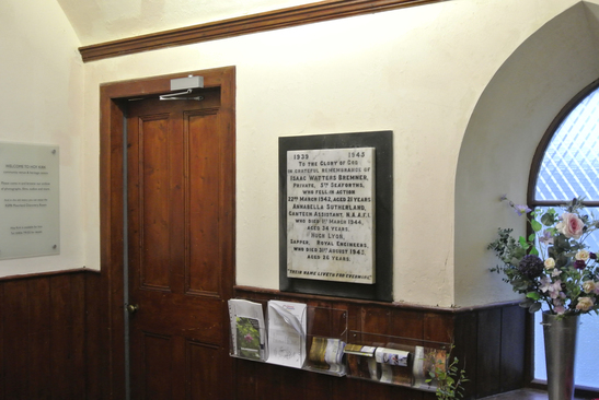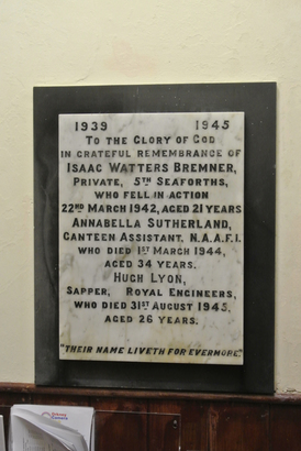 ISAAC WATTERS BREMNER,/PRIVATE, 5TH SEAFORTHS/WHO FELL IN ACTION/22ND MARCH 1942,AGED 21 YEARS/ ANNABELLA SUTHERLAND,/CANTEEN ASSISTANT, N.A.A.F.I./WHO DIED 1ST MARCH 1944,/AGED 34 YEARS/ HUGH LYON,/SAPPRT, ROYAL ENGINEERS,/WHO DIED 31ST AUGUST 1945,/AGED 26 YEARS