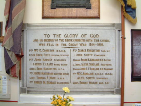 Column 1- PTE WM. CLOUSTON R.A.S.C./ C.S.M. DAVID FLETT LIVERPOOL SCOTTISH/ PTE HAROLD T LEASK ROYAL SCOTS/ SERGT JOHN MACINTYRE R.F.A./ PTE JOSEPH MATHESON SCOTTISH RIFLES/ LTE. THOMAS F MUIR R.N.R./ PTE ROBERT M REMDALL SEAFORTHS/ Column 2- PTE GEORGE ROBERTSON CAN. EF./ PTE JOHN SCOTT CAMERONS/ SEAMAN FRANK S SHEARER R.N. PATROL/ L CORPL JAS. W. SINCLAIR SEAFORTHS/ SEAMAN JOHN E L SINCLAIR H.M. TRANSPORT/ PTE W.C. SINCLAIR R.M.L.I. (R.N.R.)/ PTE ALEX. SMITH SEAFORTHS/ CORPL. ROBERT WILSON CAN E.F.