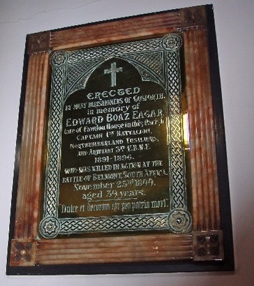 Memorial to Captain Edward Boaz Eagar,, Son of Colonel Edward Hungerford Eagar and Elizabeth Eagar (daughter of the late Denis Kelly of Castle Kelly, Co Galway Ireland). Educated at Wellington College. Commissioned into the 41st Foot from the Royal Military College, Aug 1880. Transferred to the 5th Foot in Oct 1880. Promoted to Lieutenant Jul 1881 and to Captain Jan 1890. He was adjutant to the 3rd Volunteer Battalion Northumberland Fusiliers, Jun 1891 to Jun 1896. He served in the Nile Expedition 1898, and was present at the battle of Khartoum, receiving the medal, also the Egyptian medal, with clasp. He deployed to South Africa with his battalion for the Second Anglo Boer War, sailing in the beginning of Oct 1899, and being early on the scene, ware employed on garrison duty in Cape Colony till Lt Gen Lord Methuen commenced his advance from Orange River. He was killed in action aged 39 years at the Battle of Belmont, North of Hopetown, Cape Colony on 23 Nov 1899. It is stated that he was killed by a wounded Boer who was holding up a white flag. He was buried on the battlefield. His remains were later reinterred in West End Cemetery, Kimberley, Northern Cape, South Africa. Captain Eagar was married to Ada Mary Barbara Eagar, daughter of Colonel Thoyts, and left a widow and four children.