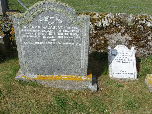 IN/MEMORY OF/HUGH MACAULAY/LOST AT SEA/27TH MARCH 1943/HMS DASHER/FROM/CLADDACH FRIENDS