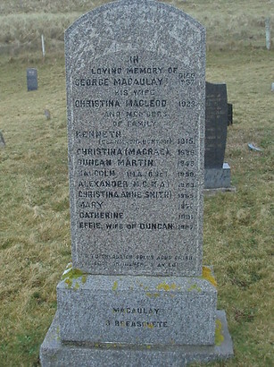 IN/LOVING MEMORY OF/GEORGE MACAUALY DIED 1937/HIS WIFE/CHRISTINA MACLEOD 1929/AND MEMBERS/OF FAMILY/KENNETH (CLAN MACNAUGHTON) 1915/....