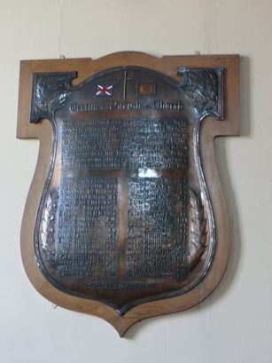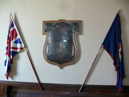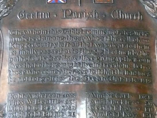 GRETNA PARISH CHURCH/ THEY WHOM THIS TABLET COMMEMORATES WERE/ NUMBERED AMONG THOSE WHO AT THE CALL OF/ KING AND COUNTRY LEFT ALL THAT WAS DEAR TO THEM/ AND FINALLY PASSED OUT OF THE SIGHT OF MEN BY THE/ PATH OF DUTY AND SELF SACRIFICE. GIVING UP THEIR/ OWN LIVES THAT OTHERS MIGHT LIVE IN FREEDOM./ LET THOSE WHO COME AFTER SEE TO IT THAT THEIR NAMES/ BE NOT FORGOTTEN. THE GREAT WAR 1914 - 1919./ (38 names)