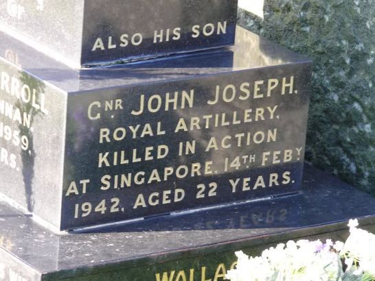 Top Base- ALSO HIS SON Middle Base-CPL JOHN JOSEPH [CARROLL]/ROYAL ARTILLERY/KILLED IN ACTION/AT SINGAPORE 14TH FEBY/1942 AGED 22 YEARS