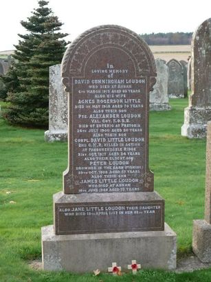 ..../ALSO THEIR SON/PTE ALEXANDER LOUDON/VAL. COY. K.O.S.B./DIED OF ENTERIC AT PRETORIA/26TH JULY 1900 AGED 20 YEARS/ALSO THEIR SON/CORPL DAVID LITTLE LOUDON/2ND CMR KILLED IN ACTION/AT PASSCHENDAELE RIDGE/31ST OCT 1917 AGED 34 YEARS/....