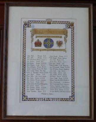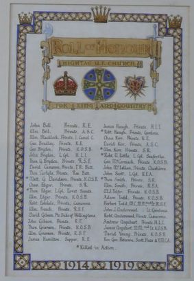 ROLL OF HONOUR/ HIGHTAE U. F. CHURCH/ FOR KING AND COUNTRY/ (NAMES)/ * KILLED IN ACTION/1914 1919