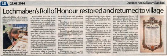 Press Cutting from the Dumfries & Galloway Standard 22 Aug 2014 page 18 about it's restoration and return to Lochmaben - Taken by Paul Goodwin 25 Oct 2014
