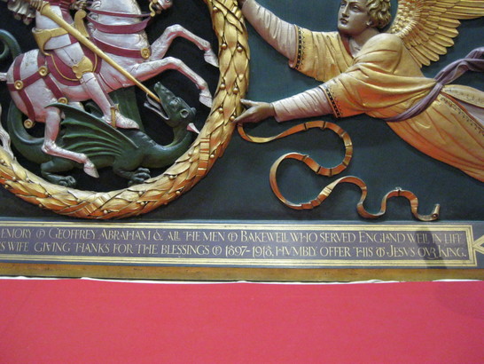 In honour of Holy Cross & St. George & in memory of Geoffrey Abraham & all the men of Bakewell who served England well in life & in death, Charles Bishop of Derby & Mary his wife giving thanks for the blessings of 1897 – 1918, humbly offer this to Jesus our King.