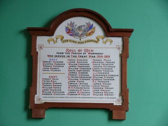 FOR KING AND COUNTRY/ROLL OF MEN/FROM THE PARISH OF WAMPHRAY/WHO SERVED IN THE GREAT WAR 1914-1919/NAVY/[names]/ARMY/[names]/THOSE MARKED + ARE COMMEMORATED ON A TABLET IN THE CHURCH
