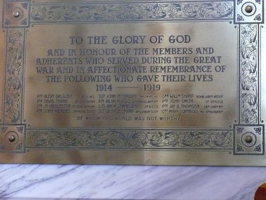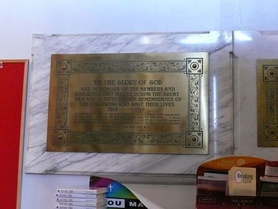 TO THE GLORY OF GOD/AND IN HONOUR OF THE MEMBERS AND/ADHERENTS WHO SERVED DURING THE GREAT/WAR AND IN AFFECTIONATE REMEMBRANCE OF/THE FOLLOWING WHO GAVE THEIR LIVES/1914-1919/[names]/OF WHOM THE WORLD WAS NOT WORTHY