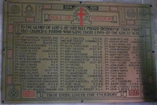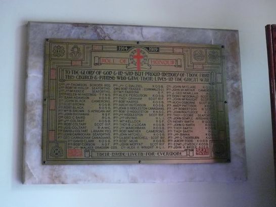 1914 1919/ROLL OF HONOUR/TO THE GLORY OF GOD & IN SAD BUT PROUD MEMORY OF THOSE FROM/THIS CHURCH & PARISH WHO GAVE THEIR LIVES IN THE GREAT WAR/[names in 3 columns]/THEIR NAME LIVETH FOR EVERMORE