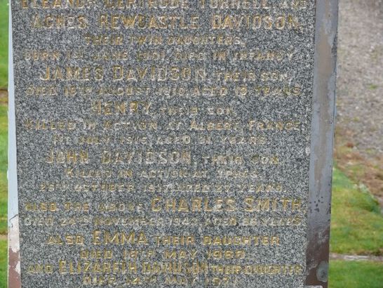 …./HENRY [SMITH] THEIR SON/KILLED IN ACTION AT ALBERT, FRANCE/1ST JULY 1916, AGED 31 YEARS/ JOHN DAVIDSON THEIR SON/KILLED IN ACTION AT YPRES/26TH OCTOBER 1917 AGED 27 YEARS/….
