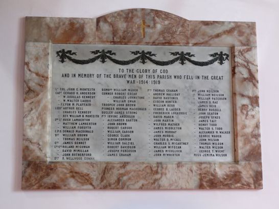 TO THE GLORY OF GOD/ AND IN MEMORY OF THE BRAVE MEN OF THIS PARISH WHO FELL IN THE GREAT/ WAR - 1914 - 1919/ (NAMES)