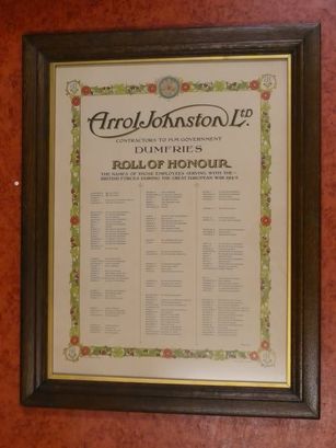 Arrol Johnston Ltd/CONTRACTORS TO HM GOVERNMENT//DUMFRIES/ROLL OF HONOUR/THE NAMES OF THOSE EMPLOYEES SERVING WITH/BRITISH FORCES DURING THE GREAT EUROPEAN WAR 1914-15/[127 names in 3 columns]