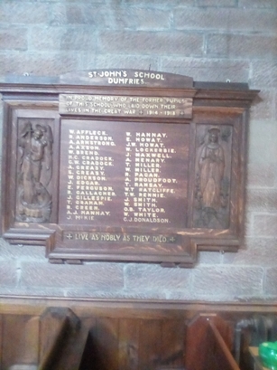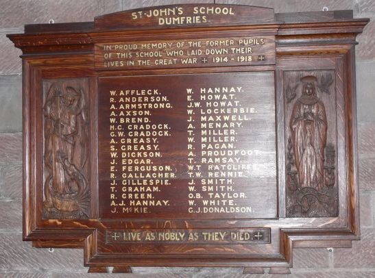 ST. JOHN'S SCHOOL/ DUMFRIES./ IN PROUD MEMORY OF THE FORMER PUPILS/ OF THIS SCHOOL WHO LAID DOWN THEIR/ LIVES IN THE GREAT WAR 1914 - 1918/ (36 names in 2 columns)/ LIVE AS NOBLY AS THEY DIED.