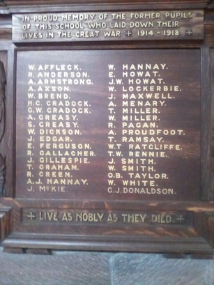 Column 1- W AFFLECK/ R ANDERSON/ A ARMSTRONG/ A AXSON/ W BREND/ H C CRADOCK/ G W CRADOCK/ A CREASY/ S CREASY/ W DICKSON/ J EDGAR/ E FERGUSON/ R GALLAGHER/ J GILLESPIE/ T GRAHAM/ R GREEN/ A J HANNAY/ J McKIE/ Column 2- W HANNAY/ E HOWAT/ J W HOWAT/ W LOCKERBIE/ J MAXWELL/ A MENARY/ T MILLER/ W MILLER/ R PAGAN/ A PROUDFOOT/ T RAMSAY/ W T RATCLIFFE/ T W RENNIE/ J SMITH/ W SMITH/ O B TAYLOR/ W WHITE/ G J DONALDSON