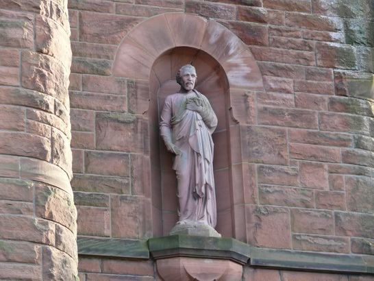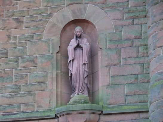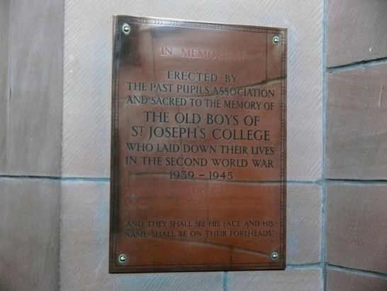 IN MEMORIAM/ ERECTED BY/ THE PAST PUPIL'S ASSOCIATION/ AND SACRED TO THE MEMORY OF/ THE OLD BOYS OF/ ST JOSEPH'S COLLEGE/ WHO LAID DOWN THEIR LIVES/ IN THE SECOND WORLD WAR/ 1939 -1945/ THE SANCTUARY CANDELABRA/ AND THE EXTERIOR STATUES/ AND THEY SHALL SEE HIS FACE AND HIS/ NAME SHALL BE ON THEIR FOREHEADS/ APOC XXIV.IV