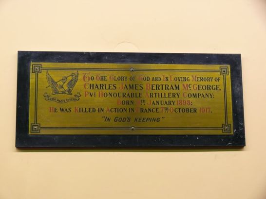TO THE GLORY OF GOD AND IN LOVING MEMORY OF/CHARLES JAMES BERTRAM MCGEORGE/PVT HONOURABLE ARTILLERY COMPANY/BORN 8TH JANUARY 1898/HE WAS KILLED IN FRANCE 7TH OCTOBER 1917/"IN GOD'S KEEPING"