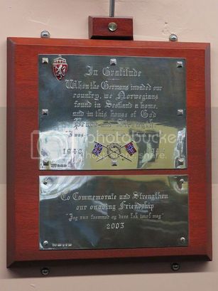 Plaque 1-In Gratitude/When the Germans invaded our/country, we Norwegians/found in Scotland a home/and in this house of God/Peace and Strength/I was a stranger and you took me in/1940 1945; Plaque 2-To Commemorate and Strengthen/our ongoing Friendship/(norwegian text)/2003