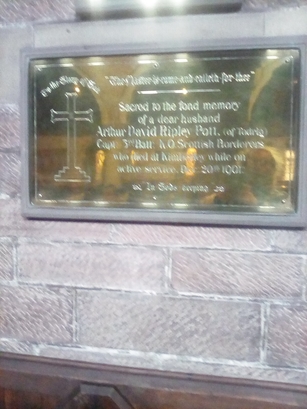 TO THE GLORY OF GOD "THE MASTER IS COME AND CALLETH FOR THEE"/ SACRED TO THE FOND MEMORY/ OF A DEAR HUSBAND/ ARTHUR DAVID RIPLEY POTT, (OF TODRIG)/ CAPT: 3RD BATT: K.O. SCOTTISH BORDERERS/ WHO DIED AT KIMBERLEY WHILE ON/ ACTIVE SERVICE, DEC. 20TH 1901./ "IN GOD'S KEEPING"