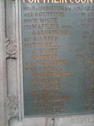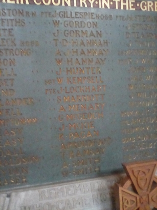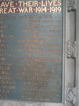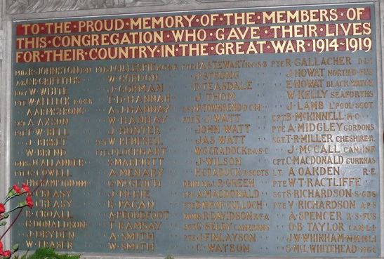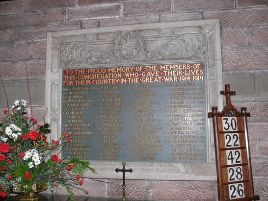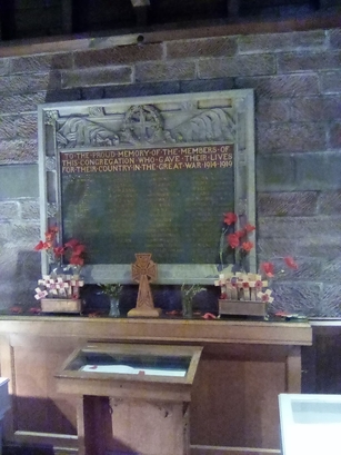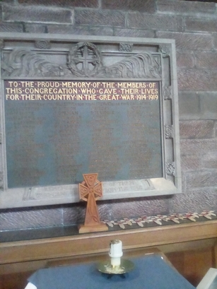 TO THE PROUD MEMORY OF THE MEMBERS OF/ THIS CONGREGATION WHO GAVE THEIR LIVES/ FOR THEIR COUNTRY IN THE GREAT WAR 1914 - 1919/ (names)/ in stone frame below the tablet-REMEMBER THE LOVE OF THEM/ WHO CAME NOT HOME FROM THE WAR