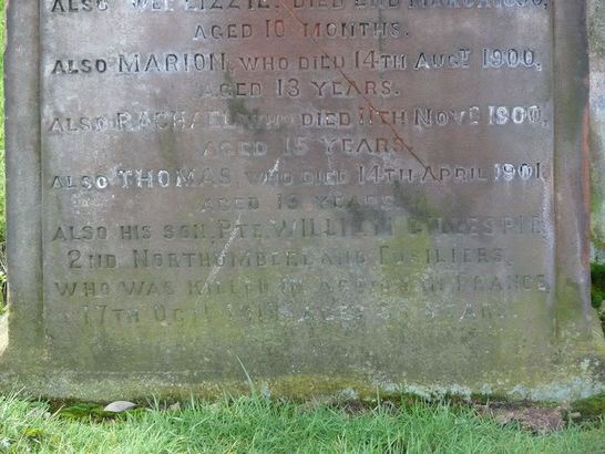 …../ALSO HIS SON PTE WILLIAM GILLESPIE/2ND NORTHUMBERLAND FUSILIERS/WHO WAS KILLED IN ACTION IN FRANCE/17TH OCTOBER 1918 AGED 38 YEARS