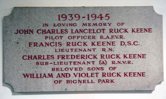 1939 - 1945 / IN LOVING MEMORY OF / JOHN CHARLES LANCELOT RUCK KEENE / PILOT OFFICER R.A.F.V.R. / FRANCIS RUCK KEENE D.S.C. / LIEUTENANT R.N. / CHARLES FREDERICK RUCK KEENE / SUB-LIEUTENANT (A) R.N.V.R. / BELOVED SONS OF / WILLIAM AND VIOLET RUCK KEENE / OF BIGNELL PARK
