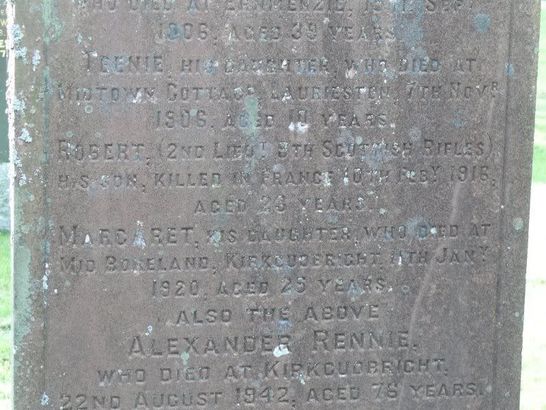 …./ROBERT [RENNIE] 2ND LIEUT 6TH SCOTTISH RIFLES/HIS SON, KILLED IN FRANCE 10TH FEBY 1916/AGED 23 YEARS/….