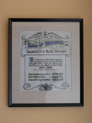 ROLL OF HONOUR/ DALBEATTIE PARK CHURCH/ IN PROUD AND SACRED MEMORY/ OF THE MEMBERS OF THIS CHURCH/ WHO GAVE THEIR LIVES FOR HOME AND/ COUNTRY IN THE SECOND WORLD WAR/ 1939 -- 1945/ "THEIR NAME LIVETH FOR EVERMORE"/ (3 names)