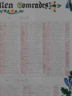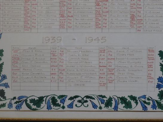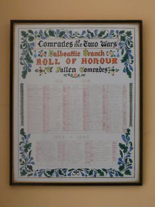 COMRADES OF THE TWO WORLD WARS/ DALBEATTIE BRANCH/ ROLL OF HONOUR/ OF FALLEN COMRADES/ 1914 - 1918/ (names in 5 columns)/ 1939 - 1945/ (names in 3 columns)