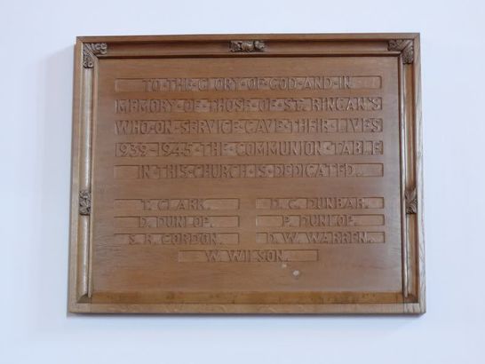 The Board: TO THE GLORY OF GOD AND IN/ MEMORY OF THOSE OF ST RINGAN'S/ WHO ON SERVICE GAVE THEIR LIVES/ 1939 - 1945. THE COMMUNION TABLE/ IN THIS CHURCH IS DEDICATED./ (names); The Table THIS DO IN REMEMBRANCE OF ME