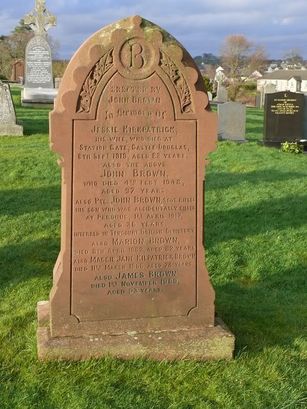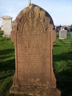 …./ALSO PTE JOHN BROWN SCOT RIFLES/HIS SON WHO WAS ACCIDENTALLY KILLED/AT PERONNE. 1ST APRIL 1917/AGED 36 YEARS/BURIED IN TRECOURT BRITISH CEMETERY/….