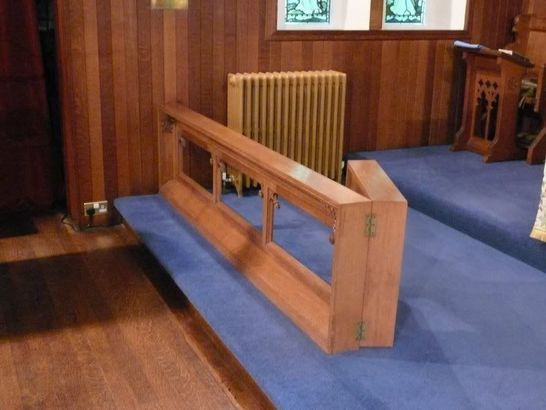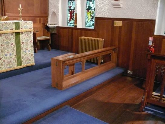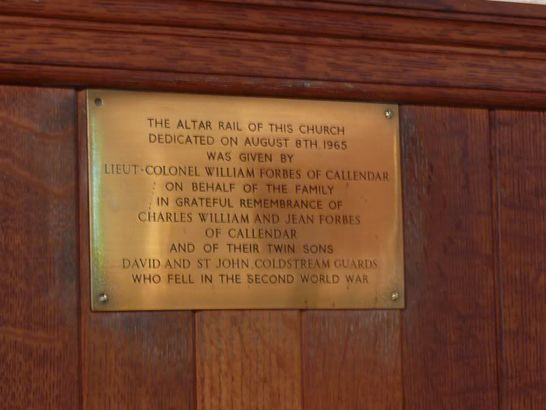 THE ALTAR RAIL OF THIS CHURCH/ DEDICATED ON AUGUST 8TH. 1965/ WAS GIVEN BY/ LIEUT-COLONEL WILLIAM FORBES OF CALLENDAR/ ON BEHALF OF THE FAMILY/ IN GRATEFUL REMEMBRANCE OF/ CHARLES WILLIAM AND JEAN FORBES/ OF CALLENDAR/ AND OF THEIR TWIN SONS/ DAVID AND ST JOHN, COLDSTREAM GUARDS/ WHO FELL IN THE SECOND WORLD WAR.