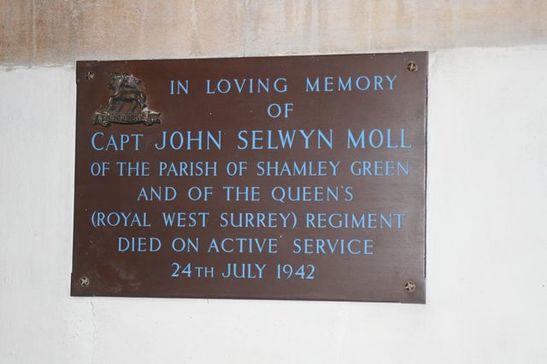 IN LOVING MEMORY/ OF/ CAPT JOHN SELWYN MOLL/ OF THE PARISH OF SHAMLEY GREEN/ AND OF THE QUEEN'S/ (ROYAL WEST SURREY) REGIMENT/ DIED ON ACTIVE SERVICE/ 24TH JULY 1942