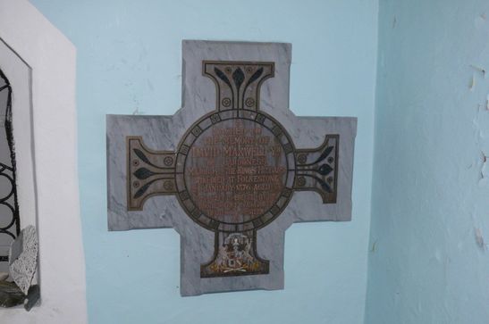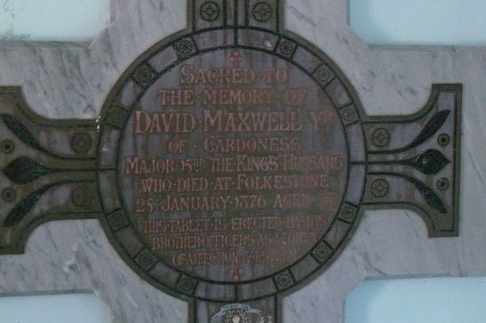 SACRED TO/THE MEMORY OF/DAVID MAXWELL YR/OF CARDONESS/MAJOR 15TH THE KINGS HUSSARS/WHO DIED AT FOLKESTONE/25 JANUARY 1876/AGED 33/THIS TABLET IS ERECTED BY HIS/BROTHER OFFICERS AS A TOKEN/OF AFFECTION & ESTEEM