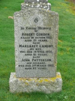 In Loving Memory/OF/ROBERT GORDON/KILLED IN ACTION 1917/AGED 21 YEARS/ALSO/MARGARET LAMONT/HIS WIFE/WHO DIED 14TH FEB 1971/AGED 81 YEARS/ALSO/JOHN PATTERSON/HER HUSBAND/WHO DIED 30TH MARCH 1962/AGED 87 YEARS