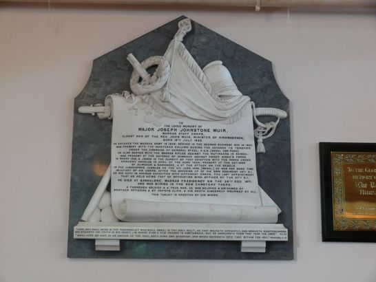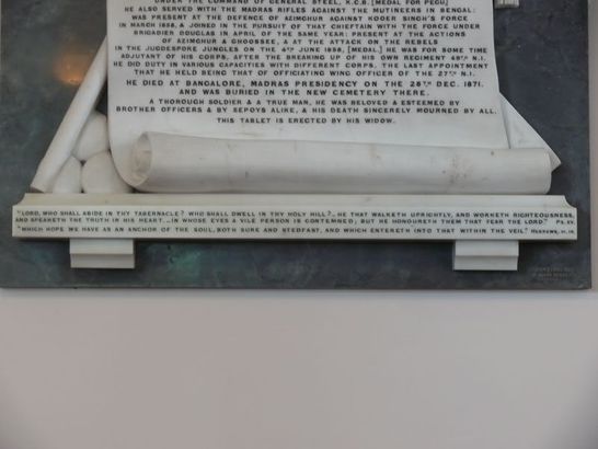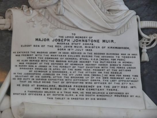 To The loved memory of Major Joseph Johnstone Muir, Madras Staff Corps, Eldest son of the Rev. John Muir, Minister of Kirkmabreck, Born 18th July 1833 He entered the madras army in 1850: served in the second Burmese war in 1852: was present with the Martaban column during the advance to Tonghoo under the command of General Steel, KCB (medal for Pegu) he also served with the Madras Rifles against the mutineers in Bengal: was present at the defence of Azimghur agains Kooer Singh's force in March 1858, & joined in the pursuit of that chieftain with the force under Brigadier Douglas in April of the same year? present at the actions of Azimghur & Ghoossee, & at the attack on the rebels in the Jugdespore Jungles on the 4th June 1858, [medal.] He was for some time Adjutant of his corps, after the breaking up of his own regiment 49th NI he died at Bangalore, Madras Presidency on the 28th Dec 1871 and was buried in the new cemetery there. A thorough soldier & a true man, he was beloved & esteemed by brother officers & by sepoys alike, & his death sincerely mourned by all. This tablet is erected by his widow.