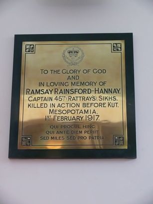 TO THE GLORY OF GOD/AND/IN LOVING MEMORY OF/RAMSAY RAINSFORD-HANNAY/CAPTAIN 45TH (RATTRAY'S) SIKH'S/KILLED IN ACTION BEFORE KUT/MESOPOTAMIA/1ST FEBRUARY 1917/QUI PROCUL HINC/QUI ANTE DIEM PERIIT/SED MILES SED PRO PATRIA