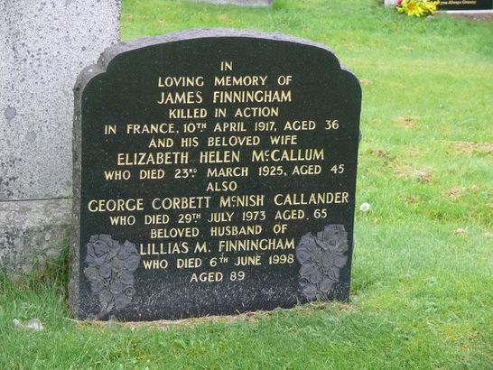 IN/LOVING MEMORY OF/JAMES FINNINGHAM/KILLED IN ACTION/IN FRANCE 10TH APRIL 1917 AGED 36/ALSO HIS BELOVED WIFE/ELIZABETH HELEN MCCALLUM/WHO DIED 23RD MARCH 1925 AGED 45/.....